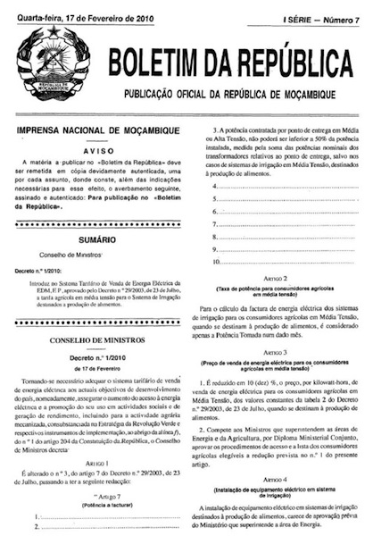 O Decreto 1/2010, que introduz a tarifa agrícola, determina, dentre vários requisitos, que o agricultor deve submeter a candidatura “em requerimento dirigido ao Ministério da Energia” onde além da descrição da instalação eléctrica, sua natureza e função precisa de apresentar um “plano de produção para pelo menos três anos seguintes”, pode-se ler do diploma ministerial assinado por Salvador Namburete e Soares Nhaca, então ministros da Energia e Agricultura, respectivamente.