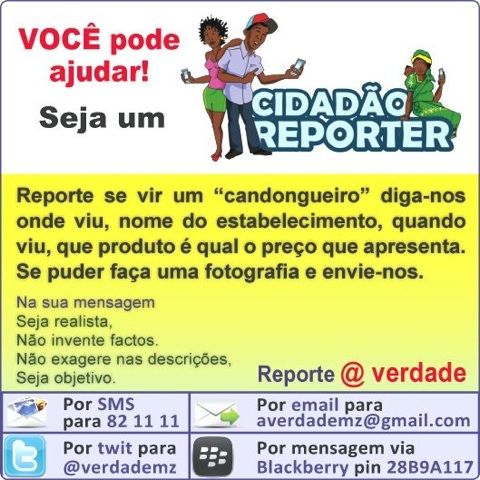 Diga-nos onde viu, nome do estabelecimento, quando viu, que produto é qual o preço que apresenta. Se puder faça uma fotografia e envie-nos por SMS para 82 11 11, para o EMAIL:averdademz@gmail.com, pelo TWITTER @verdademz ou por uma MENSAGEM BLACKBERRY (pin 28B9A117).