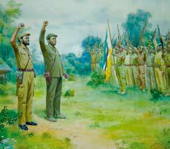 Pela História que nos contam, esta foto, ou melhor esta pintura mural fotografada, deve retratar um campo de treino do movimento que libertou Moçambique. Pelas personalidades retratadas, a imagem diz respeito aos primeiros anos da luta. Na foto vê-se Samora – que no passado dia 29 completaria 75 anos se fosse vivo – e Mondlane a incentivarem um grupos de guerrilheiros. Os mais atentos detectam um anacronismo: por estes anos, e mesmo depois da independência, a bandeira da Frelimo, embora com as mesmas cores e símbolos, não era esta. As faixas ou riscas partiam diagonalmente do canto superior esquerdo para o canto inferior direito.