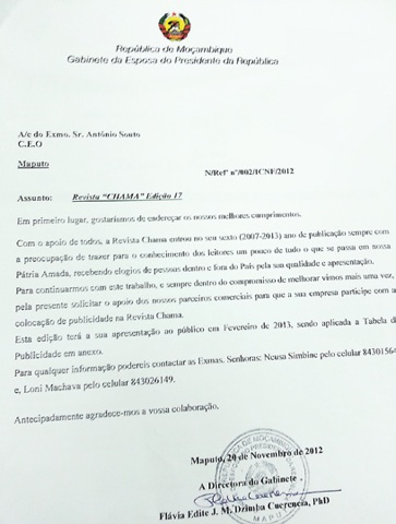 A revista que serve de instrumento de propaganda do Gabinete da Primeira-Dama tem como responsável Flávia Cuereneia, directora da publicação e esposa de Aiuba Cuereneia, ministro de Planificação e Desenvolvimento. Através de uma mão amiga, o @Verdade teve acesso a uma carta de pedido de apoio dirigida ao Presidente do Conselho de Administração da HCB. A HCB é uma empresa pública detida maioritariamente pelo Estado moçambicano.
