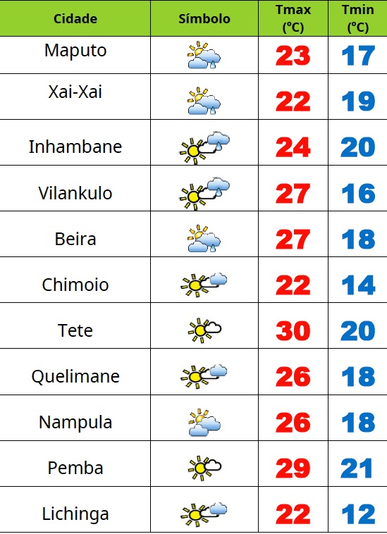 Para as províncias de Tete, Zambézia, Manica e Sofala está previsto céu pouco nublado localmente nublado; Possibilidade de chuviscos locais; Ocorrência de neblinas ou nevoeiros matinais; Vento de sueste fraco a moderado.