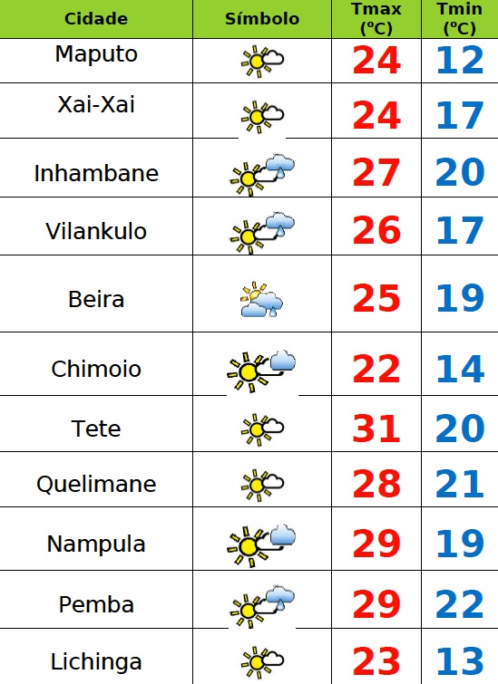 Para as províncias de Tete, Zambézia, Manica e Sofala está previsto céu pouco nublado localmente nublado; Possibilidades de chuviscos ao longo da zona costeira de Sofala; Neblinas ou nevoeiros matinais; Vento de nordeste a sueste fraco a moderado.