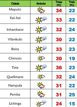 Nas províncias de Inhambane, Gaza e Maputo o INAM prevê céu pouco nublado, com períodos de muito nublado, possibilidade de ocorrência de aguaceiros fracos com trovoadas no extremo sul de Maputo; Neblinas matinais locais com vento de nordeste por vezes de sueste fraco a moderado, soprando por vezes com rajadas.