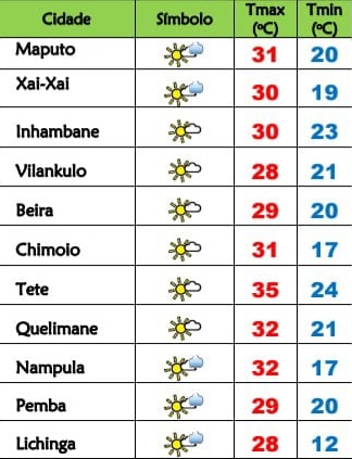 Para as províncias de Tete, Zambézia, Manica e Sofala está previsto céu nublado localmente sendo muito nublado; Neblinas e nevoeiros matinais locais; Vento de sueste a leste fraco a moderado.