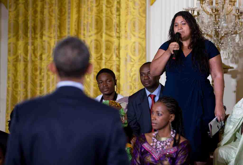 (Pergunta) -Muito obrigada. Olá Sr. Presidente e olá a todos. Chamo-me Fátima Sungo e sou do Mali. Tenho uma pergunta para lhe fazer e antecipo, com interesse, a sua resposta. Mas antes disso, gostaria de lhe dizer, Sr. Presidente, como nos sentimos honrados de estar na sua presença e de expressarmos as vozes da juventude africana, dos jovens líderes africanos e, claro, agradecermos o seu reconhecimento e a oportunidade que nos deu de estarmos aqui e também reconhecemos a nossa própria responsabilidade de levar a sua voz aos nossos países. Gostaria de dizer que estou convencida que este é um importante ponto de viragem, o início de mudanças importantes, a extraordinária iniciativa de nos convidar para estarmos aqui. Gostaria de saber quando é que teve essa ideia. Quando é que pensou que trazer-nos aqui seria uma boa ideia? Gostaria de saber qual foi a sua linha de pensamento, Sr. Presidente.