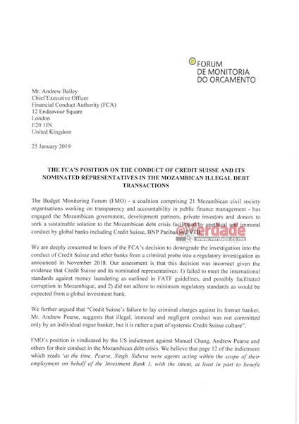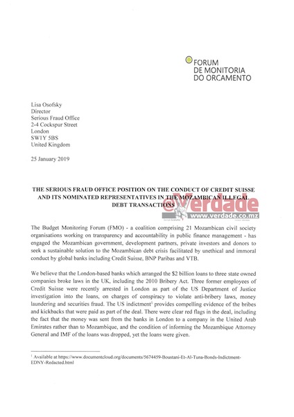 Noutra missiva, endereçada a Agência de combate à corrupção do Reino Unido, o Fórum de Monitoria do Orçamento solicita o ponto de situação da investigação levada à cabo pela instituição aos bancos que emprestaram os 2 biliões de dólares e pede explicação sobre que medidas correctivas serão levadas à cabo para garantir ao povo moçambicano o compromisso da agência em fazer cumprir a lei britânica.