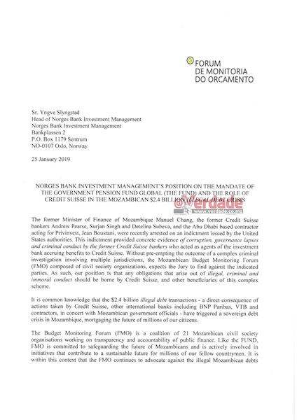Ao Banco norueguês de investimentos, accionista do banco suíço através do seu Fundo de Pensões, as Organizações da Sociedade Civil moçambicana apelam ao seu compromisso de “fazer as coisas bem” responsabilizando a Administração do Credit Suisse pela sua conduta nas dívidas ilegais e recomendem o cancelamento das mesmas.