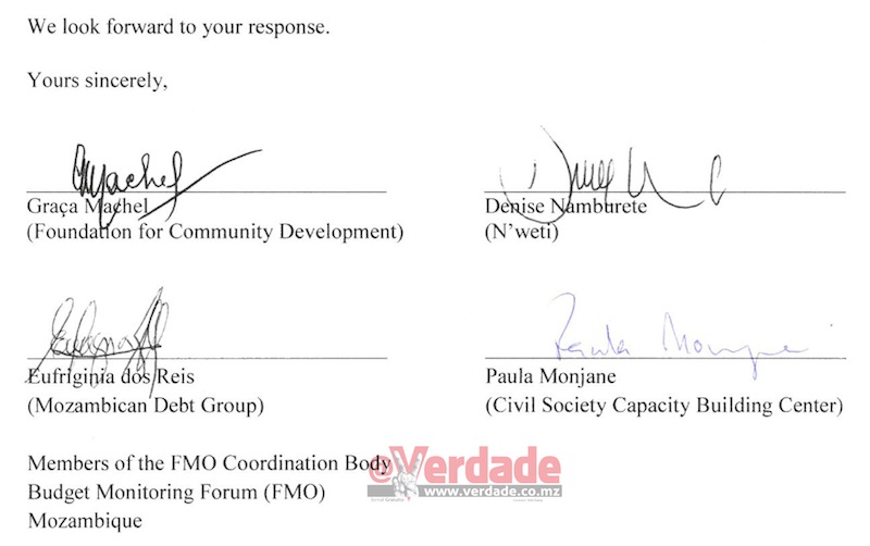 As cinco cartas, datadas de 25 de Janeiro, estão assinadas, em representação da Sociedade Civil, por Paula Monjane do Centro de Aprendizagem e Capacitação da Sociedade Civil, Eufriginia dos Reis do Grupo Moçambicano da Dívida, Denise Namburete da N´weti e ainda por Graça Machel da Fundação para o Desenvolvimento da Comunidade, mas que é viúva do antigo presidente do partido Frelimo e primeiro Chefe de Estado moçambicano assim como pertence ao decisório Comité Central da formação política que governa o país desde 1975.