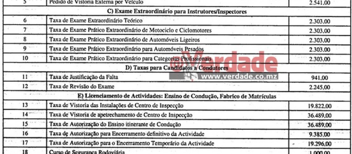 Os diversos tipos de exame extraordinário para instrutores/inspectores foram taxados em 2.303 meticais enquanto uma matrícula personalizada vai custar 43.731 meticais. Confira todos os serviços e as respectivas taxas a serem cobradas pelo INATTER: