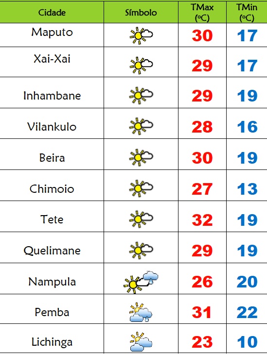 Para as províncias de Tete, Zambézia, Manica e Sofala está previsto céu geralmente pouco nublado; Ocorrências de neblinas ou nevoeiros matinais locais; Vento de sueste a leste fraco a moderado.
