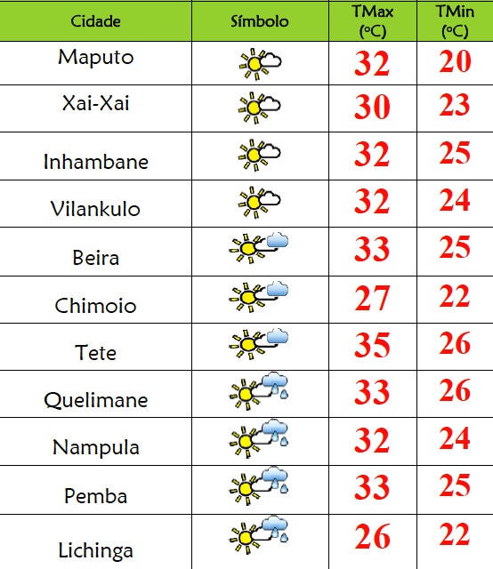 Para as províncias de Tete, Zambézia, Manica e Sofala está previsto tempo quente com céu pouco limpo, localmente nublado; Possibilidade de chuvas fracas em Sofala e Tete, podendo ocorrer temporariamente em regime moderado na Zambézia; Vento de sueste com intensidade fraca soprando por vezes com rajadas no litoral.