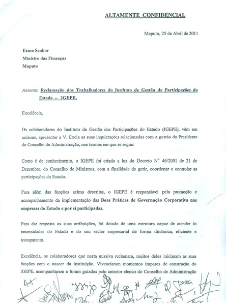 A carta extensa enviada para o Primeiro Ministro, Aires Ali, tem assinaturas de um total de 22 dos 32 trabalhadores do IGEPE, pode ser lida à seguir: