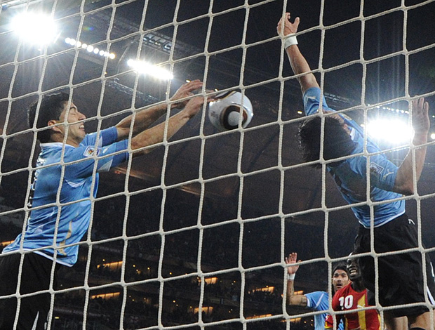 Luís Suarez, que tem sido decisivo na boa campanha dos sul-americanos marcando golos decisivos, mais uma vez voltou a ser crucial, só que em vez de marcar neste jogo não deixou o Gana marcar. Livre marcado na ala direita por Pantsil, Boateng no primeiro poste cabeceia para primeira defesa, no ressalto o camisola 10 do Gana remata para a baliza onde Muslera não está, mas um defesa corta com o pé mesmo em cima da linha do golo, novo ressalto e o camisola 18 africano cabeceia novamente para a baliza e desta vez é Suarez quem corta a bola com a mão. Cartão vermelho para o avançado sul-americano e penalti à favor do Gana.