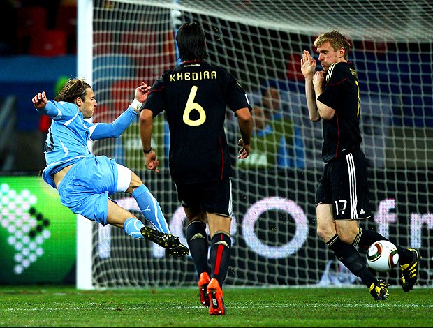 O médio Müller, que voltou da suspensão e acabou sendo eleito o melhor da partida, abriu o placar para os alemães. Cavani e Forlán viraram para o Uruguai, Jansen empatou de novo, e coube ao médio Khedira fazer o golo da vitória alemã. O guarda-redes uruguaio Muslera, herói nos quartos de final contra o Gana, falhou duas vezes. Forlán teve a chance de empatar o jogo no último lance e forçar o tempo extra, mas acertou no travessão e, logo em seguida, ouviu o apito final do juiz. A partida terminou, e Klose, de agasalho, pois chovia em Port Elizabeth, não saiu do banco. Com dores nas costas, o atacante não entrou e manteve seus 14 golos em Mundiais, um a menos que o recorde de Ronaldo Fenômeno.