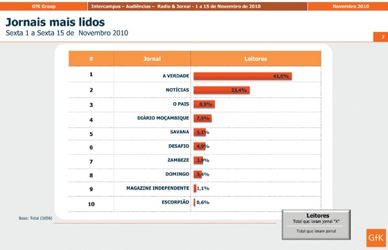 O semanário @Verdade é o jornal mais lido de Moçambique de acordo com o mais recente estudo de audiência realizado pela Intercampus, uma empresa do Grupo GFK, entre 1 e 15 de Novembro de 2010.