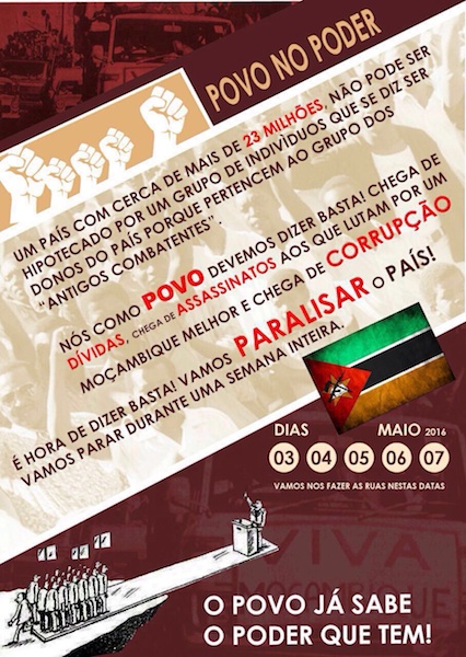 “Um país com mais de 23 milhões [de habitantes] não pode ser hipotecado por um grupo de indivíduos que se diz ser dono do país, porque pertence ao grupo dos antigos combatentes. Como povo devemos dizer basta, Chega de dívidas. Chega de assassinatos aos que lutam por um Moçambique melhor, e chega de corrupção. É hora de dizer basta! Vamos paralisar o país! Vamos parar durante uma semana inteira”, diz a mensagem.